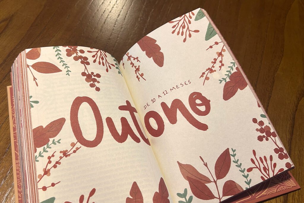 O livro propõe uma leitura sensível do primeiro ano do bebê a partir das estações do ano. O inverno representa os três primeiros meses, um período mais silencioso, introspectivo e, muitas vezes, solitário. Em seguida, a primavera surge quando o bebê começa a interagir mais com o mundo, trazendo leveza e cor aos dias. O verão marca a fase das grandes descobertas, da introdução alimentar e da curiosidade crescente. Por fim, o outono encerra esse ciclo com um convite à colheita, ao olhar para dentro e ao fortalecimento da espiritualidade, tão facilmente deixada de lado diante da intensidade que é cuidar de um recém-nascido.