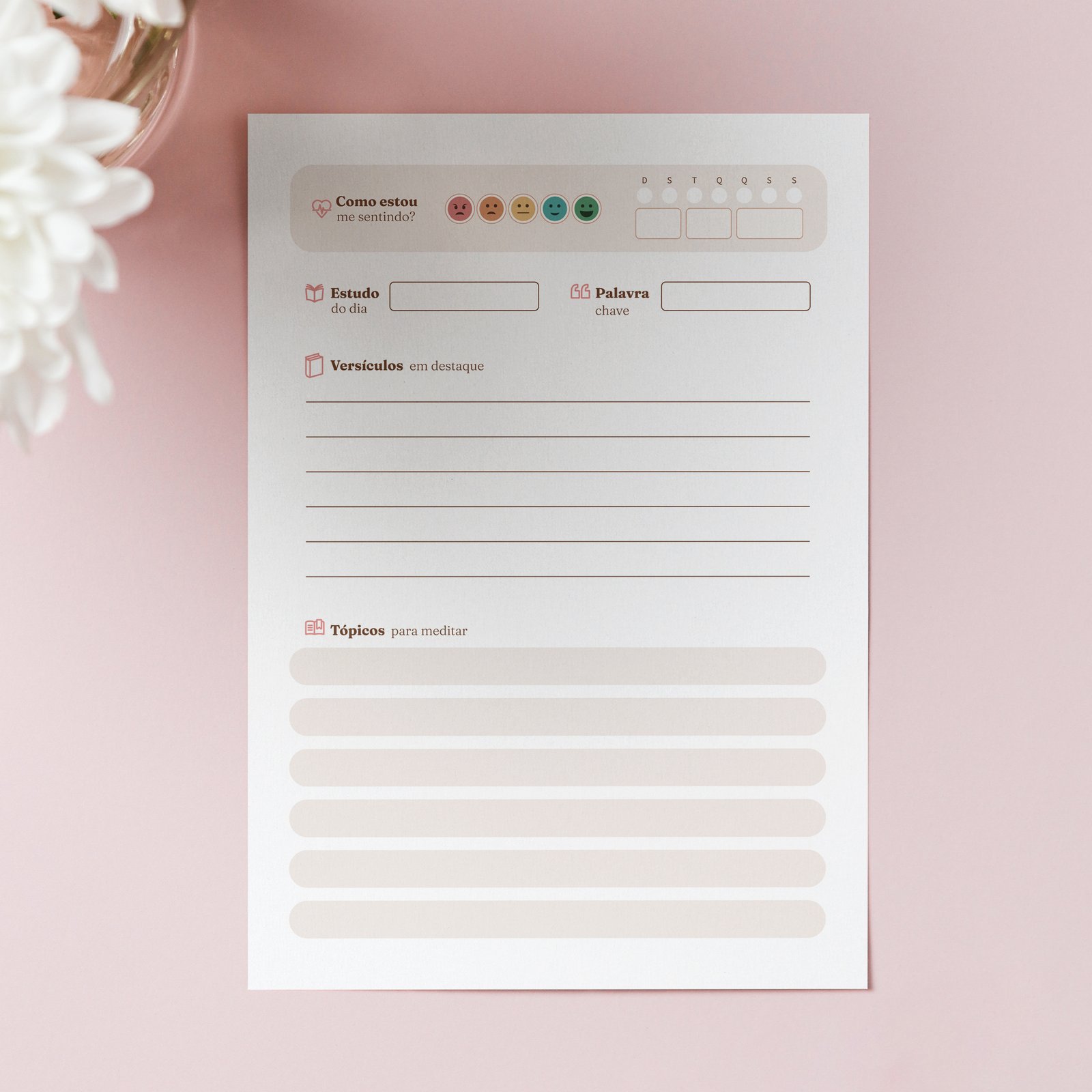 Feito exclusivamente para impressão, o caderno é perfeito para quem deseja transformar seus devocionais em um momento de intimidade, propósito e crescimento espiritual.