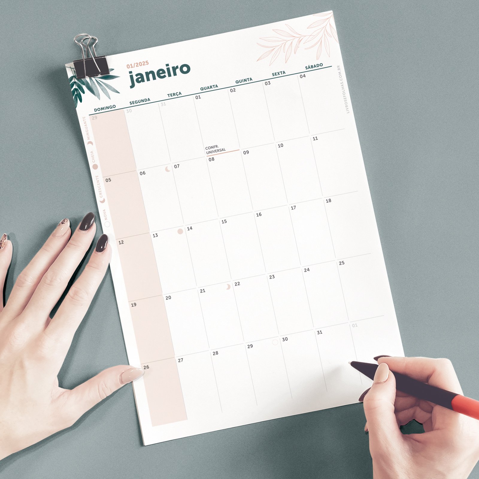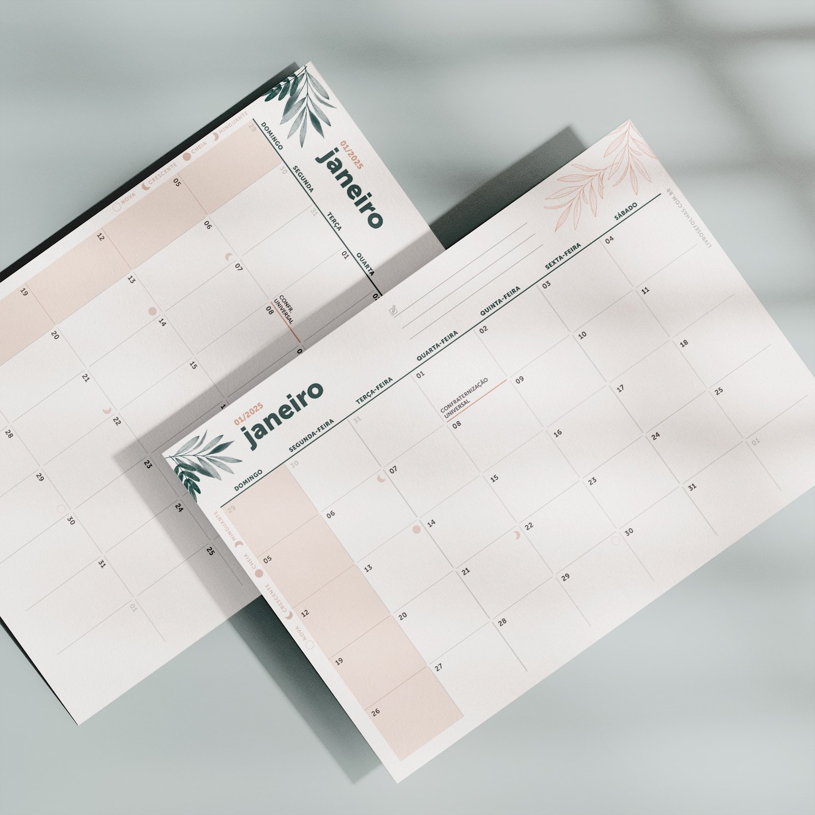 O calendário já vem com os principais feriados nacionais marcados, ajudando você a planejar viagens, folgas e períodos de descanso com antecedência. Além disso, inclui um calendário lunar, perfeito para quem gosta de acompanhar o ciclo da lua e alinhar seus planos a um ritmo mais natural e intuitivo.