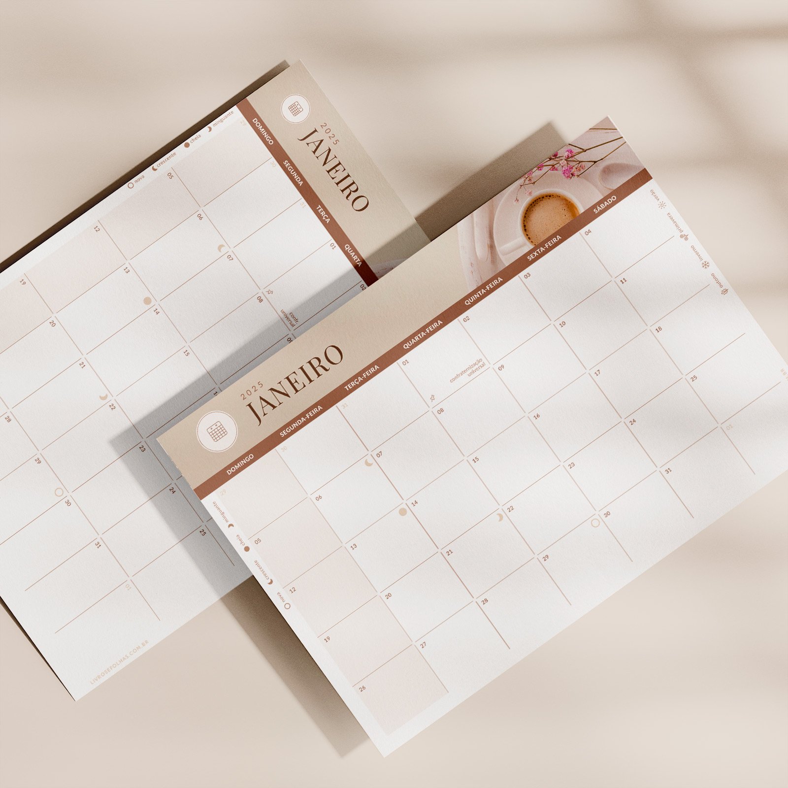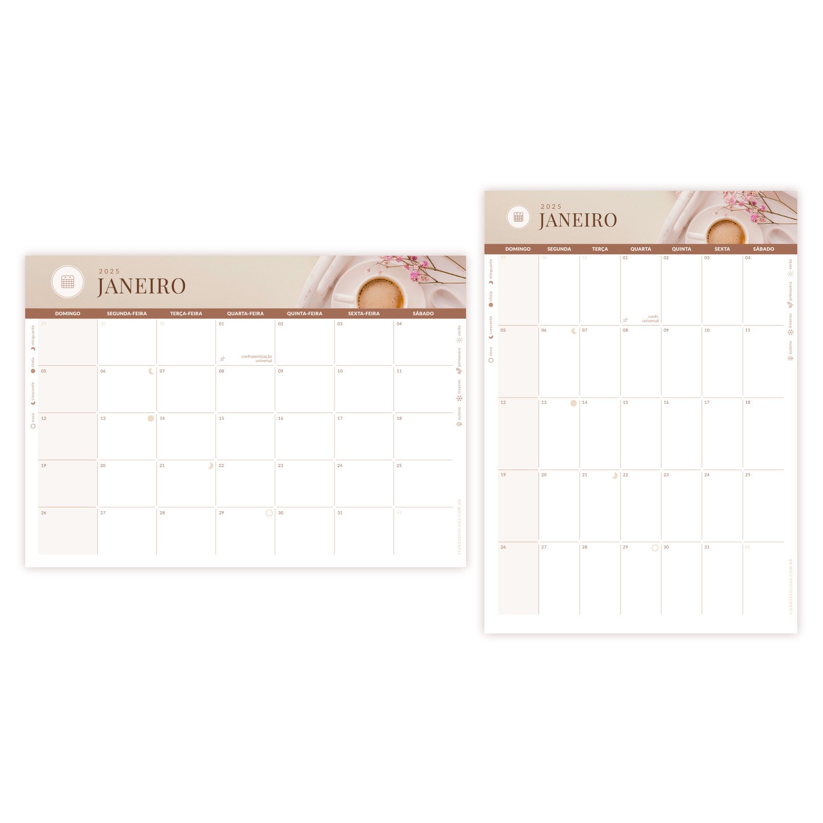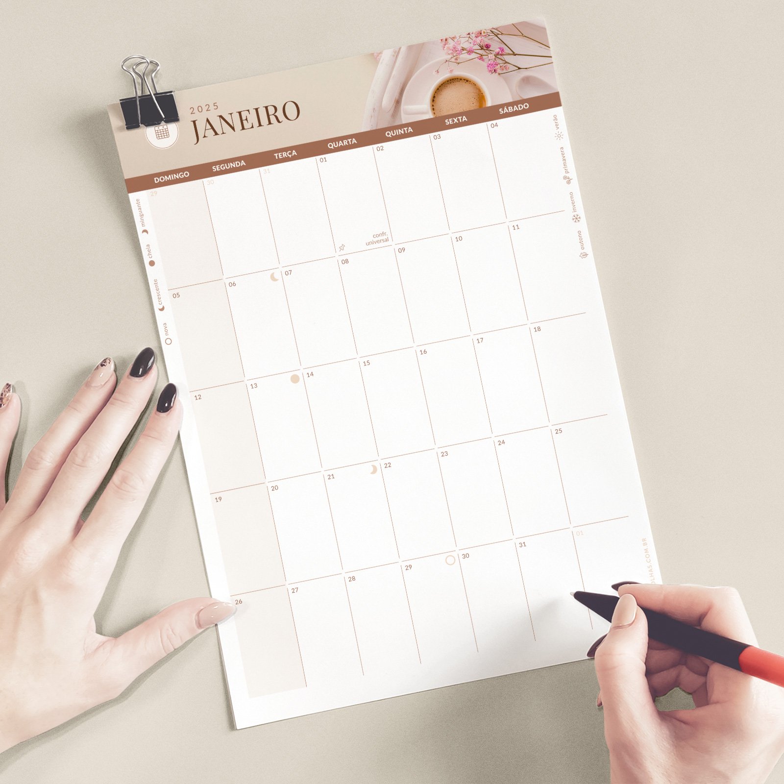 O calendário já vem com os principais feriados nacionais marcados, ajudando você a planejar viagens, folgas e períodos de descanso com antecedência. Além disso, inclui um calendário lunar, perfeito para quem gosta de acompanhar o ciclo da lua e alinhar seus planos a um ritmo mais natural e intuitivo.