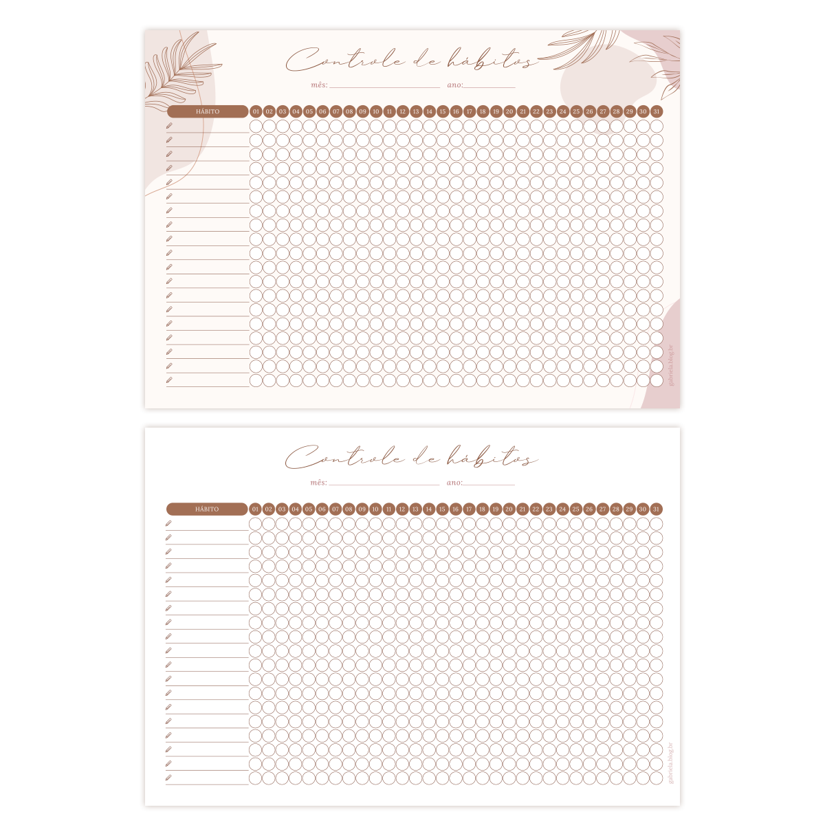 O pacote inclui 2 arquivos em PDF (um com arte completa e outro com fundo branco) para que você escolha o estilo que mais combina com a sua rotina. Basta imprimir e começar hoje mesmo sua jornada de evolução pessoal.