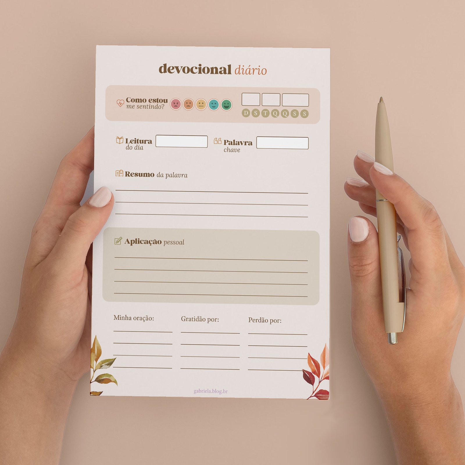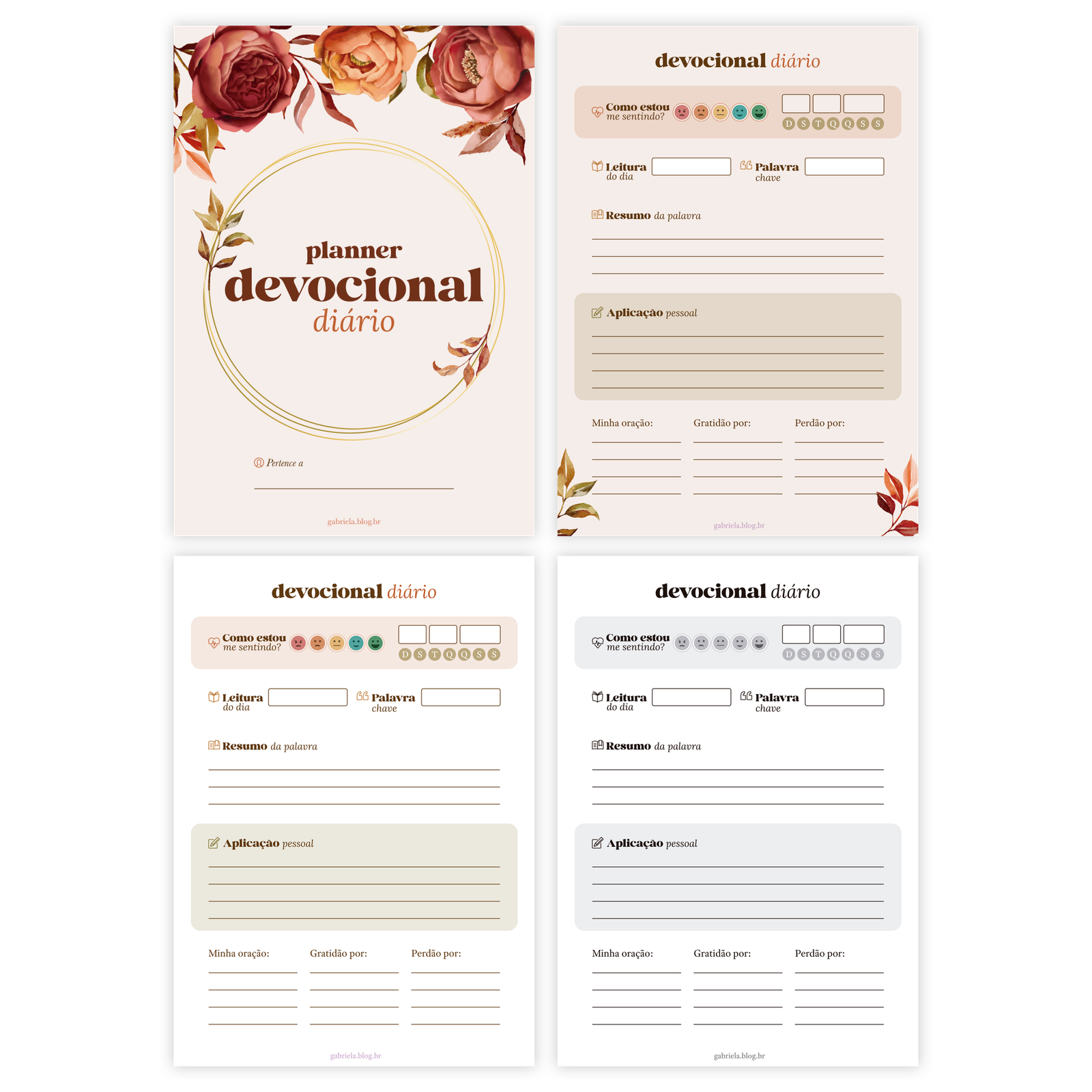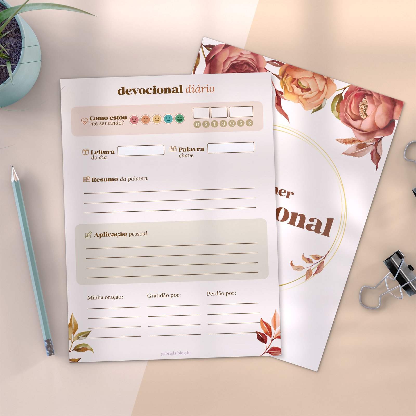 O Planner Devocional é um guia delicado e inspirador para acompanhar seus estudos diários da Palavra. Ele inclui uma capa e uma página interna para você imprimir e usar em sua rotina de oração e reflexão. Pode ser utilizado individualmente ou como parte de um caderno completo de devocionais.