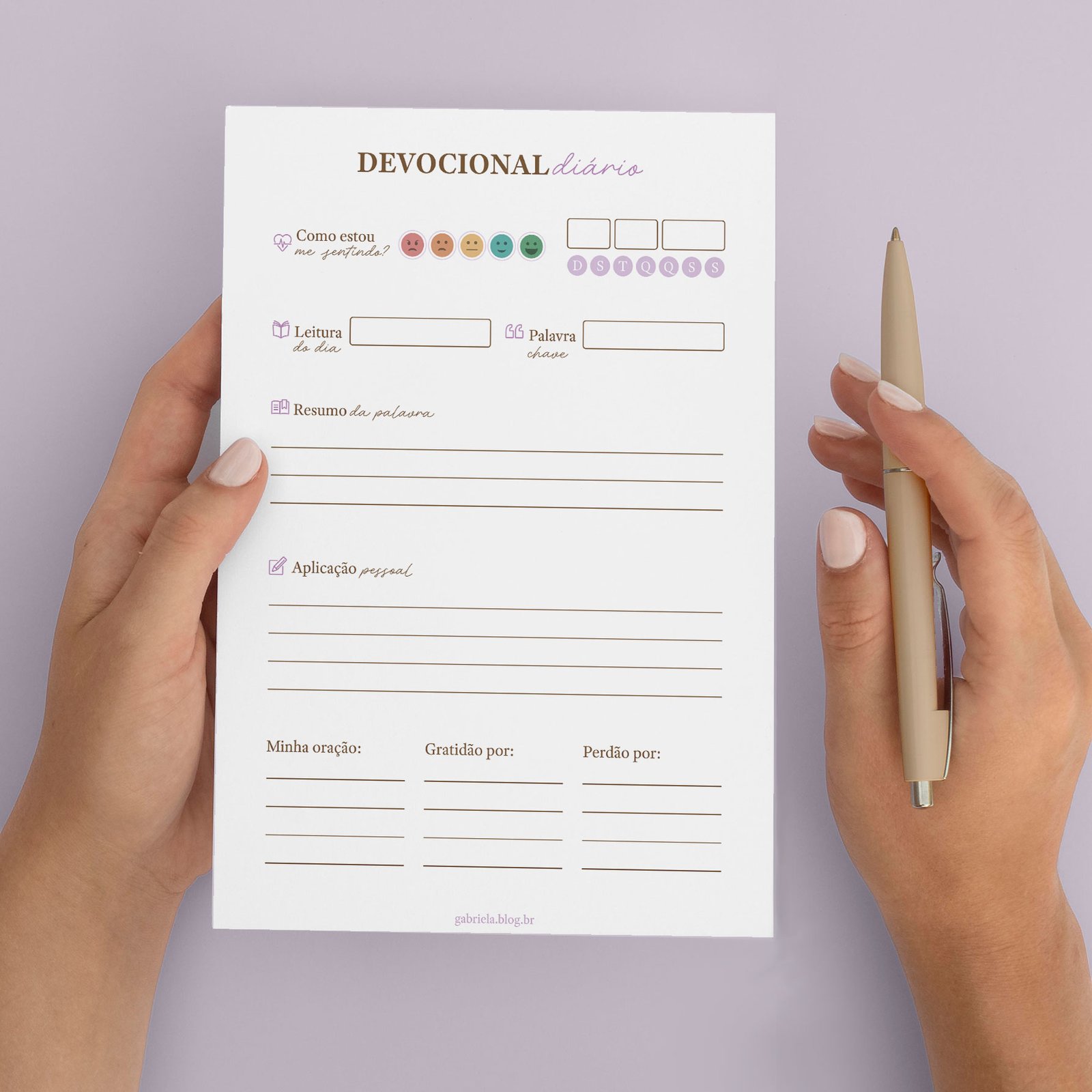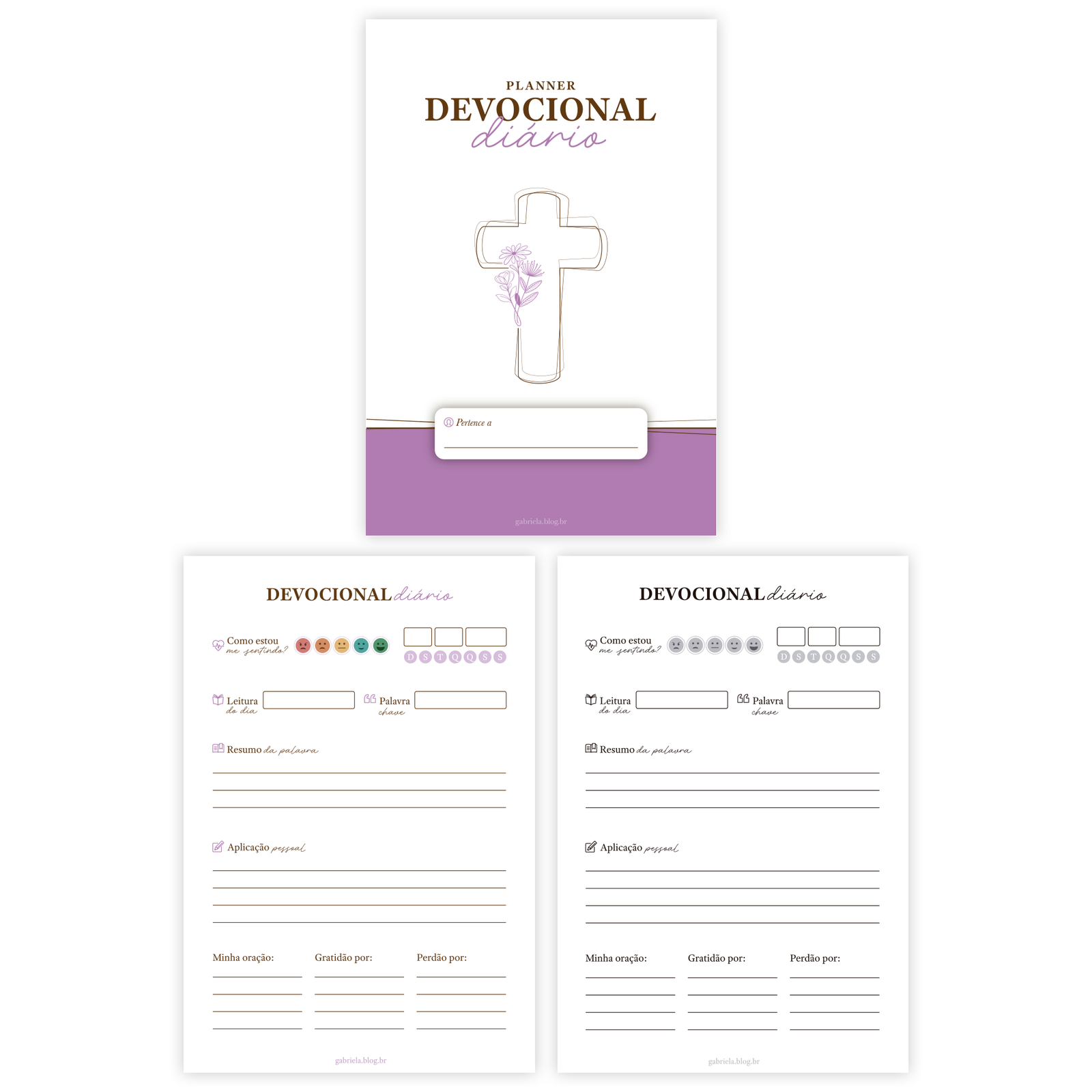 O Planner Devocional é um guia delicado e inspirador para acompanhar seus estudos diários da Palavra. Ele inclui uma capa e uma página interna para você imprimir e usar em sua rotina de oração e reflexão. Pode ser utilizado individualmente ou como parte de um caderno completo de devocionais.